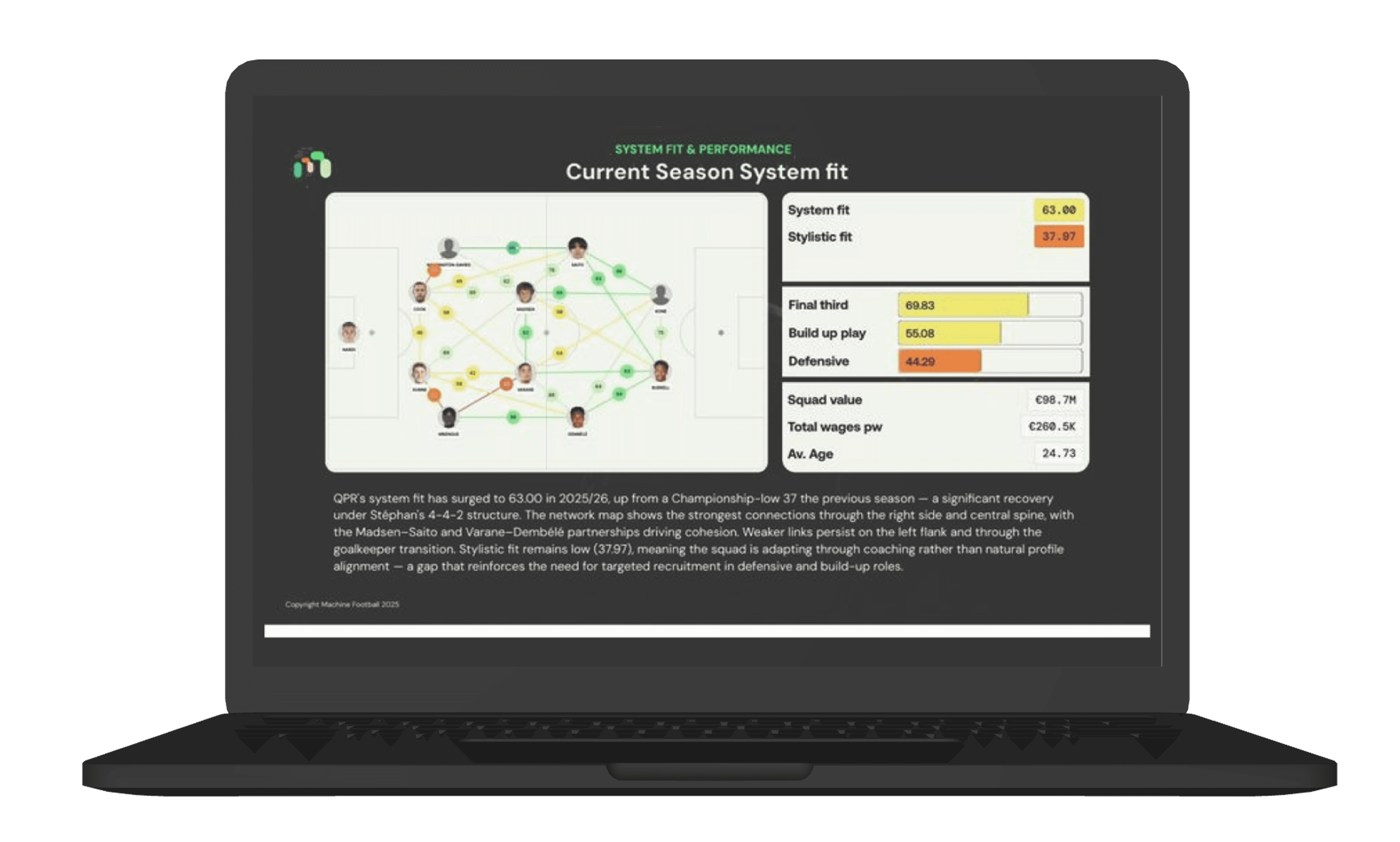 Every report is built from our proprietary Massive Model infrastructure, combining on-pitch performance, financial health, and off-pitch dynamics into a single coherent picture.